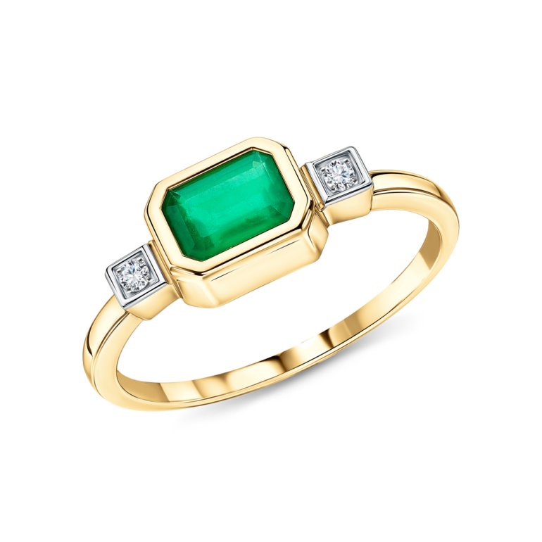 Кольцо с 2 бриллиантами природными, 0.032 карат, огранка круг 57 граней, цвет 3, чистота 6, тип огранки А; 1 изумрудом природным, 0.853 карат, цвет 3, чистота 3, тип огранки Б; Желтое золото 585 пробы.