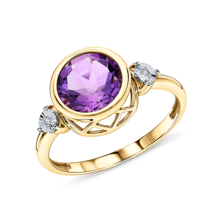 Кольцо с 2 бриллиантами природными, 0.01 карат, огранка круг 17 граней, цвет 2, чистота 2, тип огранки А; 1 аметистом природным, 1.783 карат, тип огранки В; Желтое и белое золото 585 пробы.