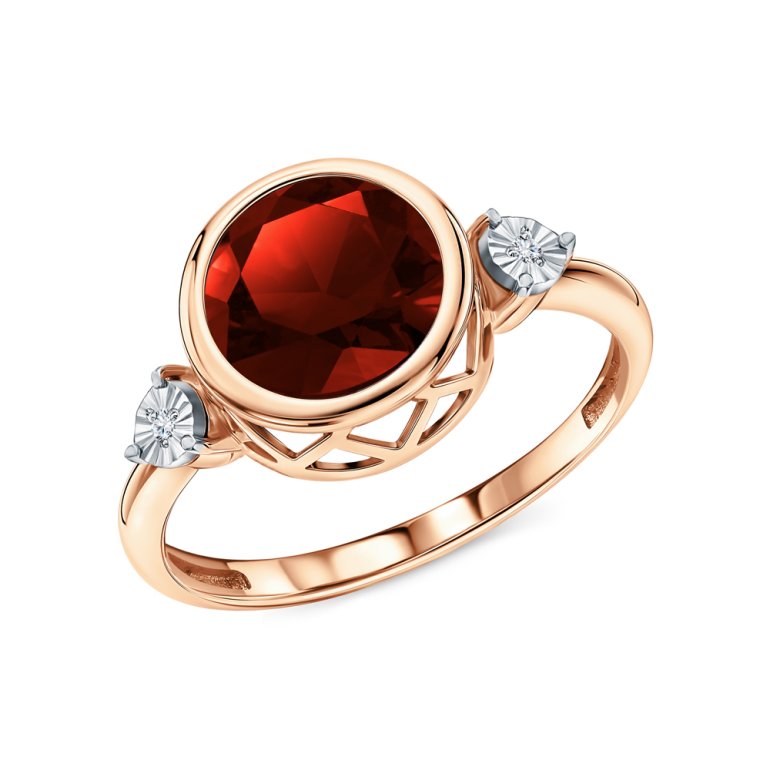 Кольцо с 2 бриллиантами природными, 0.01 карат, огранка круг 17 граней, цвет 2, чистота 2, тип огранки А; 1 гранатом природным, 2.267 карат, тип огранки В; Розовое и белое золото 585 пробы.