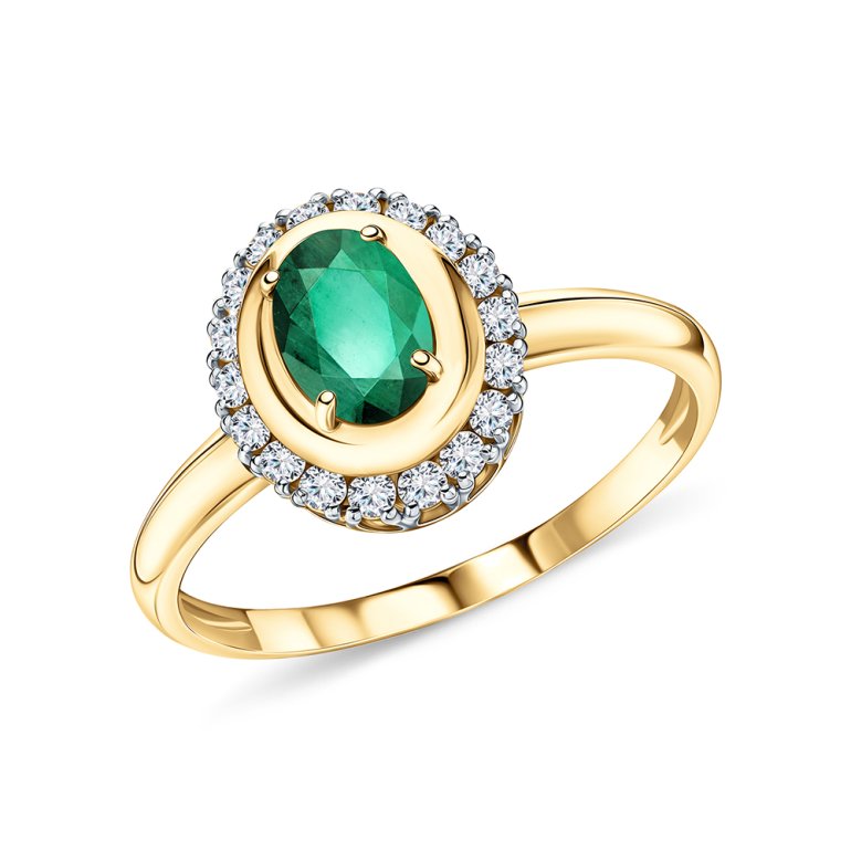 Кольцо с 18 бриллиантами природными, 0.31 карат, огранка круг 57 граней, цвет 3, чистота 6, тип огранки А; 1 изумрудом природным, 0.743 карат, цвет 3, чистота 3, тип огранки Б; Желтое золото 585 пробы.