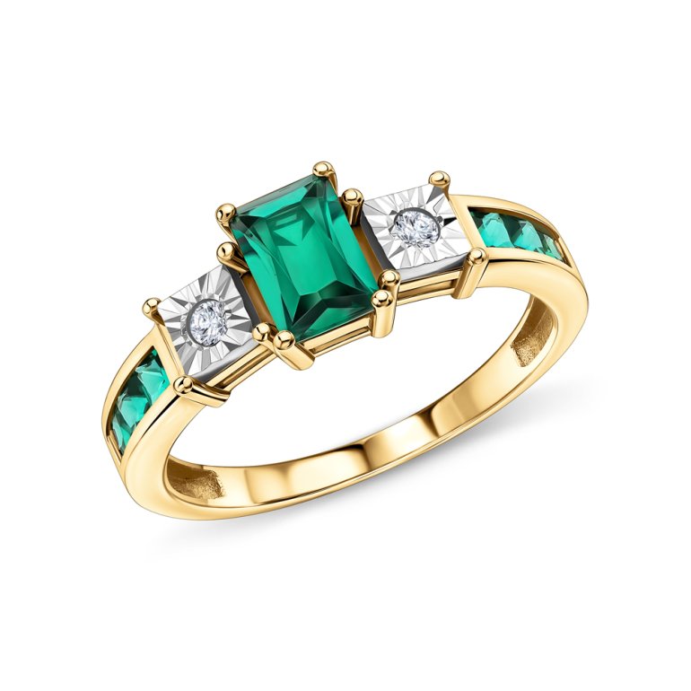 Кольцо с 2 бриллиантами природными, 0.041 карат, огранка круг 57 граней, цвет 3, чистота 6, тип огранки А; 1 гидротермальным изумрудом, 0.505 карат, тип огранки Б; 6 гидротермальными изумрудами, 0.234 карат, тип огранки Б; Желтое и белое золото 585 пробы.