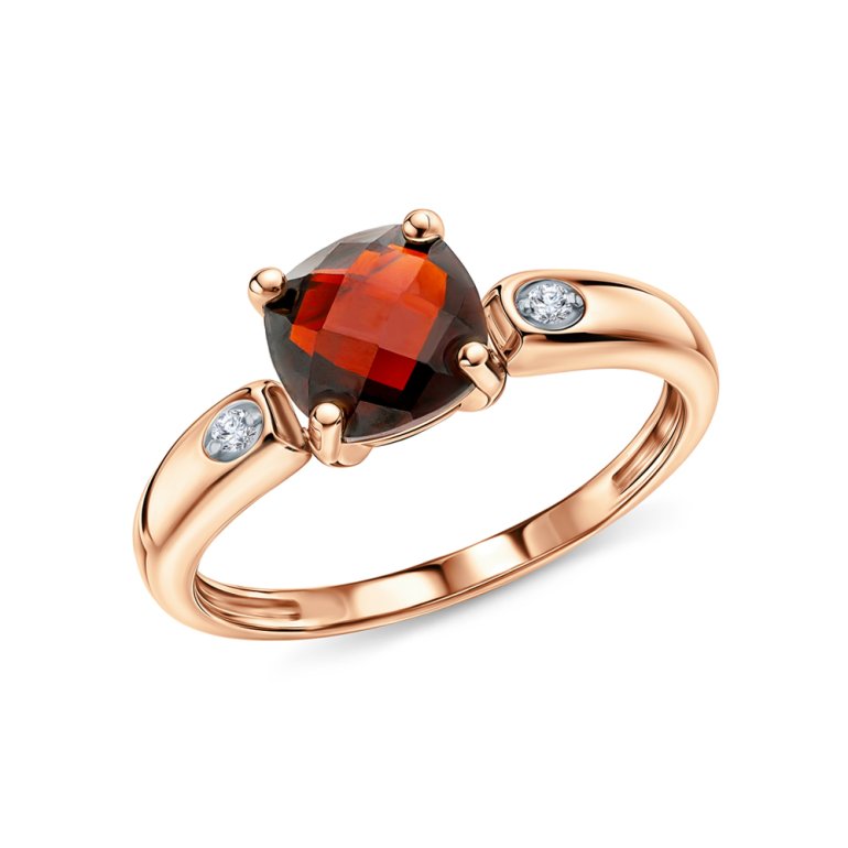 Кольцо с 1 гранатом, 1.836 карат, тип огранки Б; 2 бриллиантами, 0.026 карат, огранка круг 17 граней, цвет 2, чистота 2, тип огранки А; Розовое золото 585 пробы.