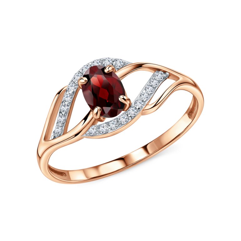 Кольцо с 1 гранатом природным, 0.565 карат, тип огранки Б; 20 бриллиантами, 0.084 карат, огранка круг 17 граней, цвет 2, чистота 2, тип огранки А; Розовое золото 585 пробы.