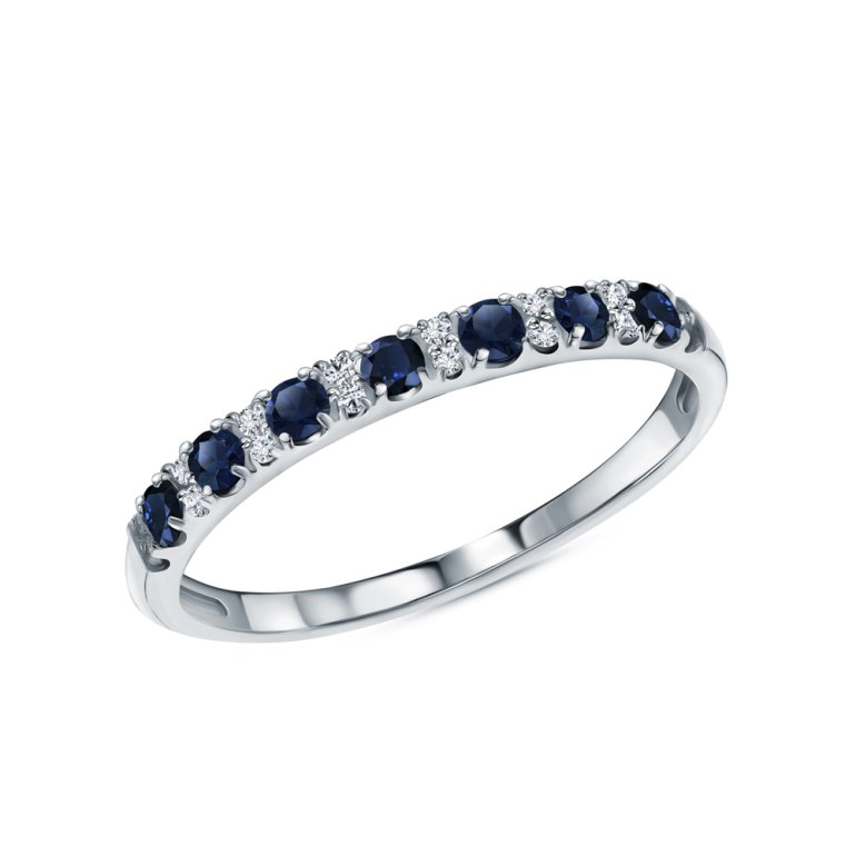 Кольцо с 16 бриллиантами природными, 0.056 карат, огранка круг 17 граней, цвет 2, чистота 2, тип огранки А; 7 сапфирами природными, 0.273 карат, цвет 2, чистота 2, тип огранки В; Белое золото 585 пробы.