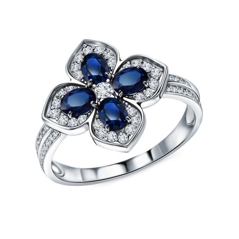 Кольцо с 4 сапфирами, 0.883 карат, цвет 2, чистота 2, тип огранки Б; 1 бриллиантом, 0.035 карат, огранка круг 57 граней, цвет 3, чистота 6, тип огранки А; 12 бриллиантами, 0.092 карат, огранка круг 57 граней, цвет 3, чистота 6, тип огранки А; 16 бриллиантами, 0.077 карат, огранка круг 17 граней, цвет 2, чистота 2, тип огранки А; 32 бриллиантами, 0.082 карат, огранка круг 17 граней, цвет 2, чистота 2, тип огранки А; Белое золото 585 пробы.