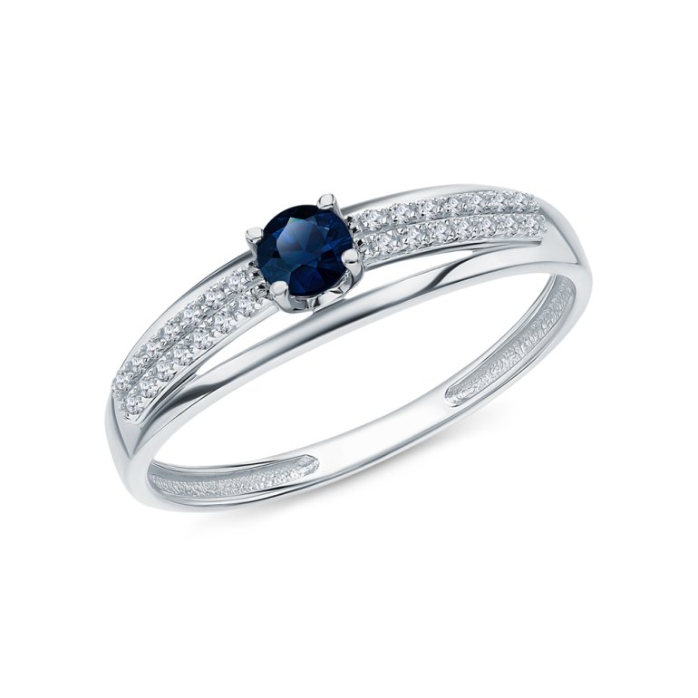 Кольцо с 1 сапфиром, 0.215 карат, цвет 2, чистота 2, тип огранки В; 28 бриллиантами, 0.072 карат, огранка круг 17 граней, цвет 2, чистота 2, тип огранки А; Белое золото 585 пробы.