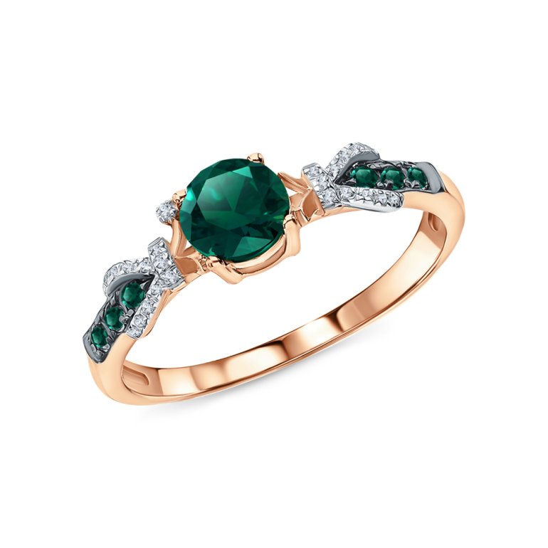 Кольцо с 1 бриллиантом природным, 0.003 карат, огранка круг 17 граней, цвет 2, чистота 2, тип огранки А; 22 бриллиантами природными, 0.04 карат, огранка круг 17 граней, цвет 2, чистота 2, тип огранки А; 1 гидротермальным изумрудом, 0.811 карат, тип огранки В; 6 гидротермальными изумрудами, 0.125 карат, тип огранки В; Розовое золото 585 пробы.
