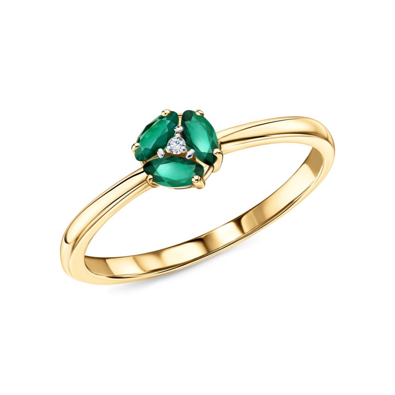 Кольцо с 1 бриллиантом природным, 0.005 карат, огранка круг 17 граней, цвет 2, чистота 2, тип огранки А; 3 изумрудами природными, 0.206 карат, цвет 3, чистота 3, тип огранки Б; Желтое золото 585 пробы.