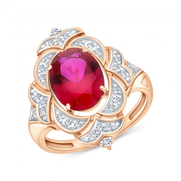 Кольцо с 4 бриллиантами природными, 0.027 карат, огранка круг 17 граней, цвет 2, чистота 2, тип огранки А; 24 бриллиантами природными, 0.083 карат, огранка круг 17 граней, цвет 2, чистота 2, тип огранки А; 1 рубином синтетическим, 2.157 карат, тип огранки Б; Розовое золото 585 пробы.