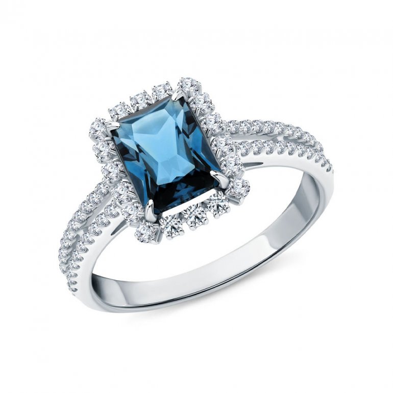 Кольцо с 1 топазом лондон, 1.892 карат, тип огранки Б; 18 сапфирами бесцветными, 0.33 карат, тип огранки В; 40 бриллиантами, 0.138 карат, огранка круг 17 граней, цвет 2, чистота 2, тип огранки А; Белое золото 585 пробы.