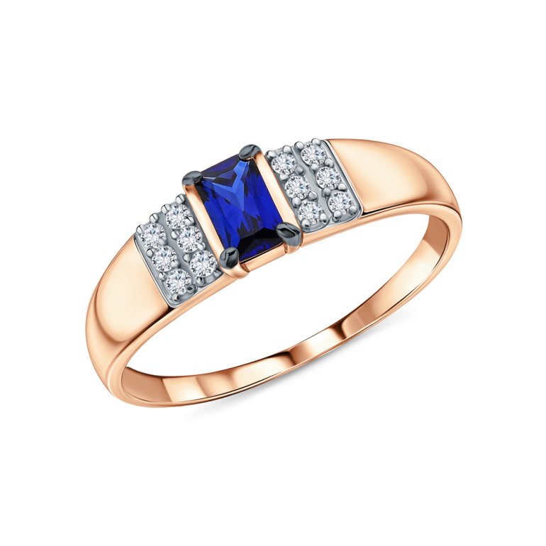Кольцо с 1 сапфиром синтетическим, 0.365 карат, тип огранки Б; 12 бриллиантами, 0.107 карат, огранка круг 17 граней, цвет 2, чистота 2, тип огранки А; Розовое золото 585 пробы.