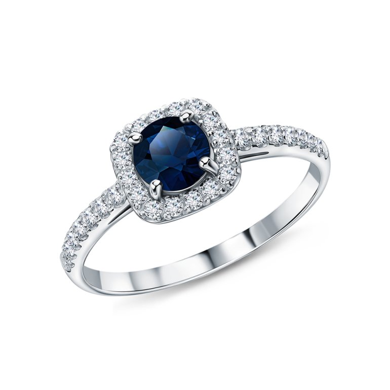 Кольцо с 1 сапфиром природным, 0.535 карат, цвет 2, чистота 2, тип огранки В; 30 бриллиантами, 0.233 карат, огранка круг 57 граней, цвет 3, чистота 6, тип огранки А; Белое золото 585 пробы.