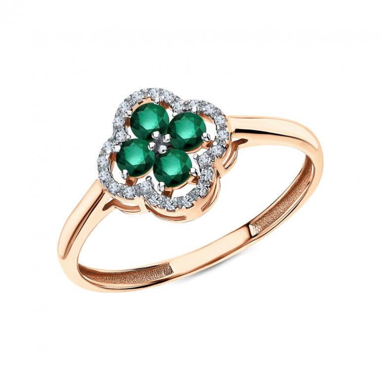 Кольцо с 4 изумрудами, 0.285 карат, цвет 3, чистота 3, тип огранки В; 24 бриллиантами, 0.062 карат, огранка круг 17 граней, цвет 2, чистота 2, тип огранки А; Розовое золото 585 пробы.