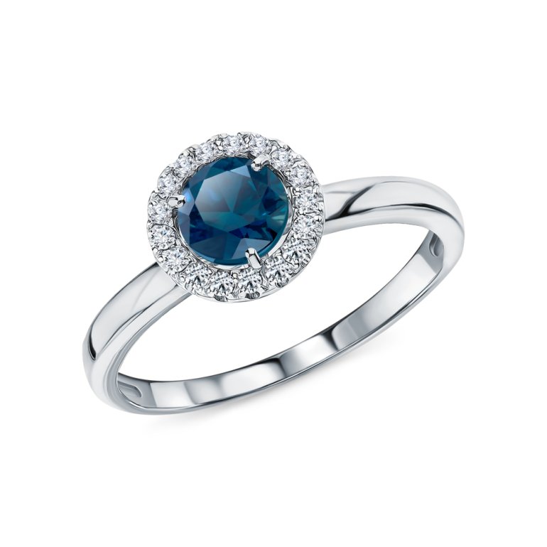 Кольцо с 1 топазом лондон, 0.543 карат, тип огранки В; 17 бриллиантами, 0.068 карат, огранка круг 17 граней, цвет 2, чистота 2, тип огранки А; Белое золото 585 пробы.
