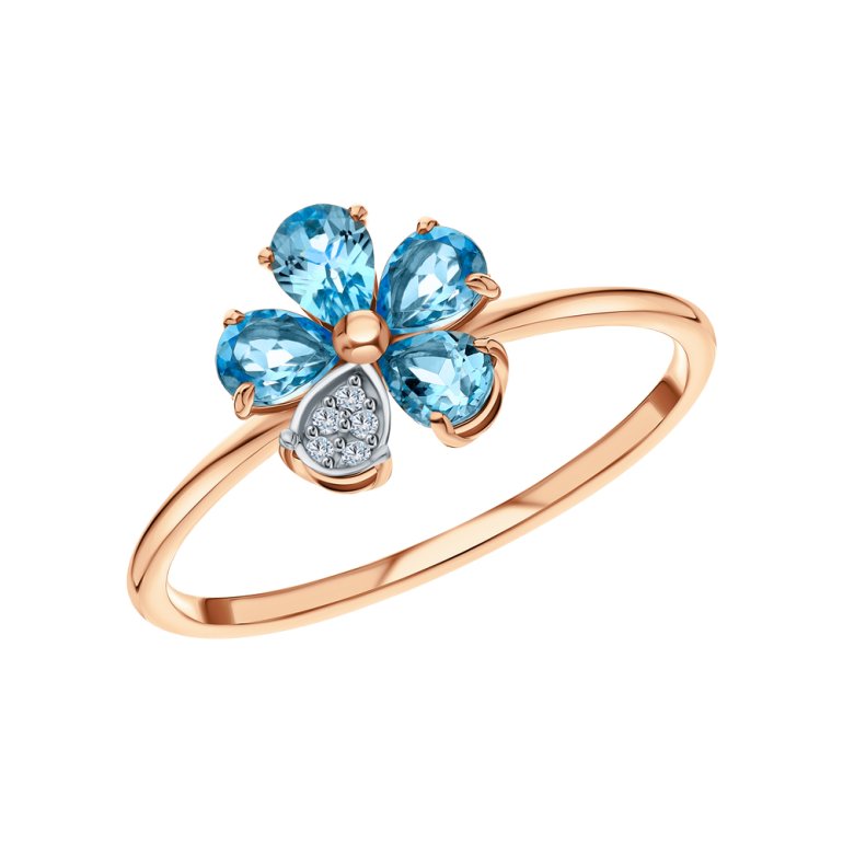 Кольцо с 5 бриллиантами, 0.012 карат, огранка круг 17 граней, цвет 2, чистота 2, тип огранки Б; 4 топазами свисс, 0.662 карат, тип огранки Б; Розовое золото 585 пробы.