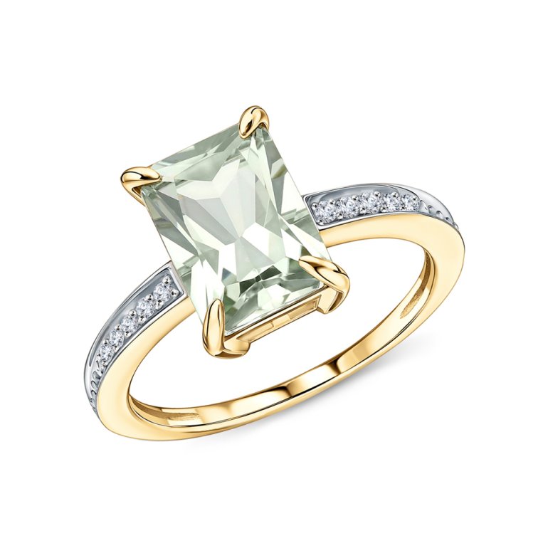 Кольцо с 1 празиолитом природным, 2.26 карат, тип огранки Б; 6 бриллиантами, 0.043 карат, огранка круг 57 граней, цвет 3, чистота 6, тип огранки А; 6 бриллиантами, 0.025 карат, огранка круг 17 граней, цвет 2, чистота 2, тип огранки А; Желтое золото 585 пробы.