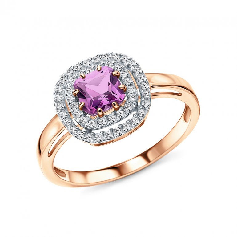 Кольцо с 1 аметистом природным, 0.557 карат, тип огранки Б; 48 бриллиантами, 0.196 карат, огранка круг 17 граней, цвет 2, чистота 2, тип огранки А; Розовое золото 585 пробы.