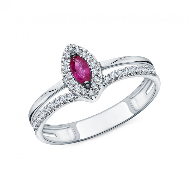 Кольцо с 34 бриллиантами природными, 0.119 карат, огранка круг 17 граней, цвет 2, чистота 2, тип огранки Б; 1 рубином природным, 0.157 карат, цвет 2, чистота 2, тип огранки Б; Белое золото 585 пробы.