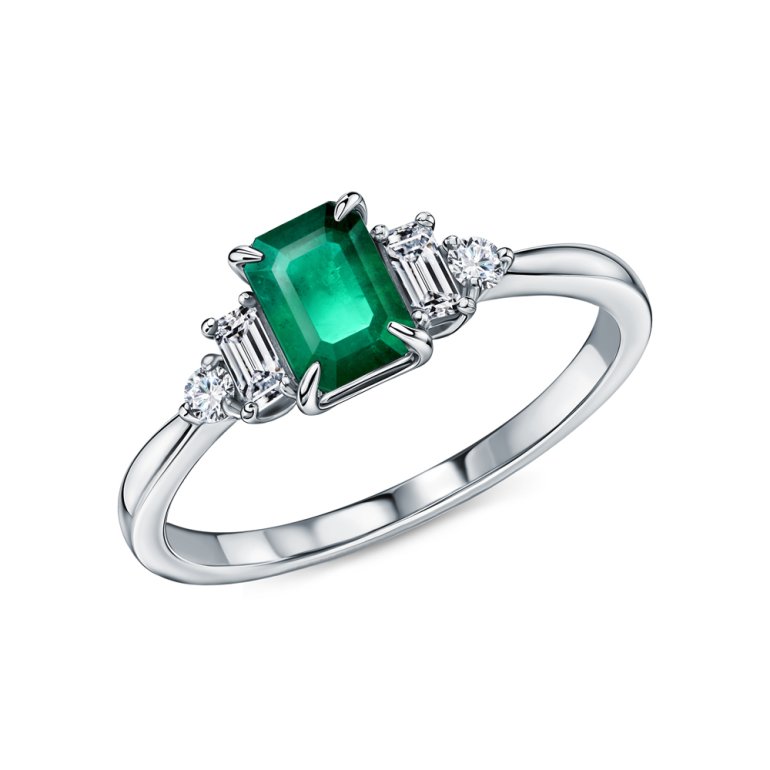 Кольцо с 1 изумрудом, 0.863 карат, цвет 3, чистота 3, тип огранки Б; 2 бриллиантами, 0.174 карат, огранка багет 25 граней, цвет 3, чистота 6, тип огранки А; 2 бриллиантами, 0.088 карат, огранка круг 57 граней, цвет 3, чистота 6, тип огранки А; Белое золото 585 пробы.