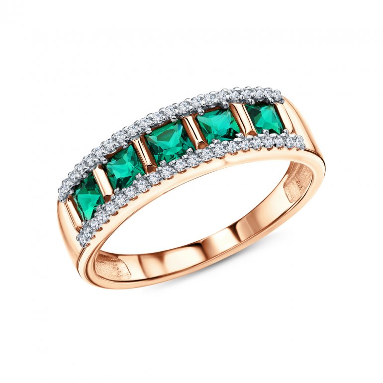 Кольцо с 5 гидротермальными изумрудами, 0.363 карат, тип огранки Б; 42 бриллиантами, 0.09 карат, огранка круг 17 граней, цвет 2, чистота 2, тип огранки Б; Розовое золото 585 пробы.