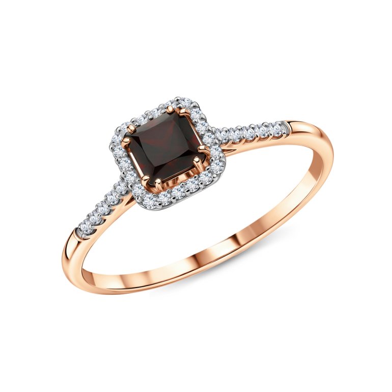 Кольцо с 1 гранатом, 0.81 карат, тип огранки Б; 10 бриллиантами, 0.079 карат, огранка круг 57 граней, цвет 3, чистота 6, тип огранки А; 32 бриллиантами, 0.157 карат, огранка круг 17 граней, цвет 2, чистота 2, тип огранки А; Розовое золото 585 пробы.