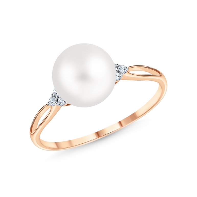 Кольцо с 6 бриллиантами природными, 0.06 карат, огранка круг 17 граней, цвет 2, чистота 2, тип огранки А; 1 жемчугом пресноводным культивированным белым; Розовое золото 585 пробы.