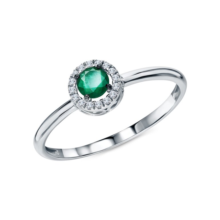 Кольцо с 16 бриллиантами природными, 0.05 карат, огранка круг 17 граней, цвет 2, чистота 2, тип огранки А; 1 изумрудом природным, 0.226 карат, цвет 3, чистота 3, тип огранки В; Белое золото 585 пробы.