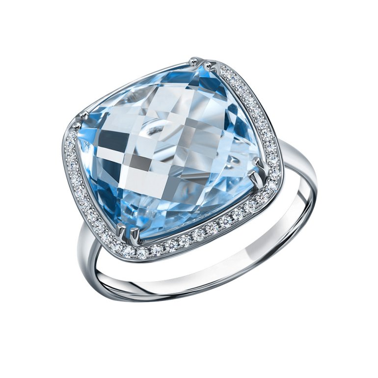 Кольцо с 1 топазом скай природным, 13.177 карат, тип огранки Б; 44 бриллиантами, 0.156 карат, огранка круг 17 граней, цвет 2, чистота 2, тип огранки А; Белое золото 585 пробы.
