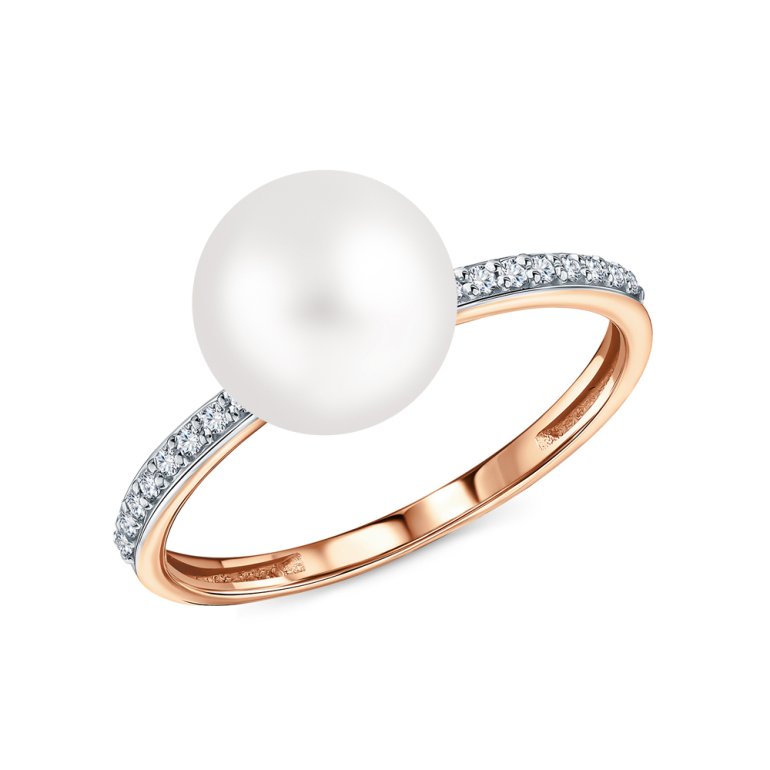 Кольцо с 16 бриллиантами природными, 0.07 карат, огранка круг 17 граней, цвет 2, чистота 2, тип огранки Б; 1 жемчугом пресноводным культивированным белым; Розовое золото 585 пробы.