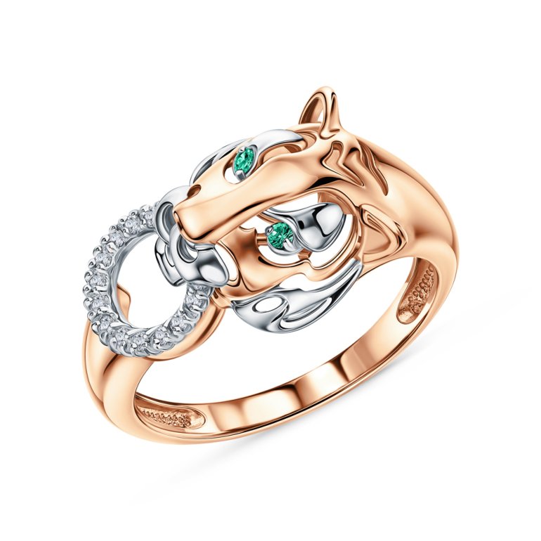 Кольцо с 12 бриллиантами природными, 0.042 карат, огранка круг 17 граней, цвет 2, чистота 2, тип огранки Б; 2 изумрудами природными, 0.009 карат, цвет 3, чистота 3, тип огранки В; Розовое золото 585 пробы.