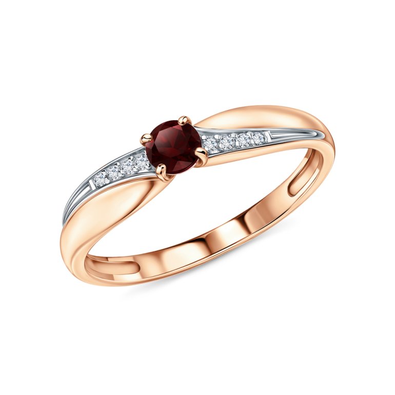 Кольцо с 1 гранатом природным, 0.227 карат, тип огранки В; 8 бриллиантами, 0.027 карат, огранка круг 17 граней, цвет 2, чистота 2, тип огранки А; Розовое золото 585 пробы.