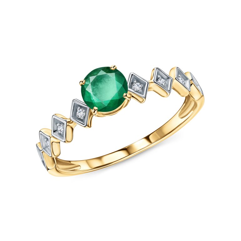 Кольцо с 8 бриллиантами природными, 0.034 карат, огранка круг 17 граней, цвет 2, чистота 2, тип огранки Б; 1 изумрудом природным, 0.447 карат, цвет 3, чистота 3, тип огранки В; Желтое золото 585 пробы.