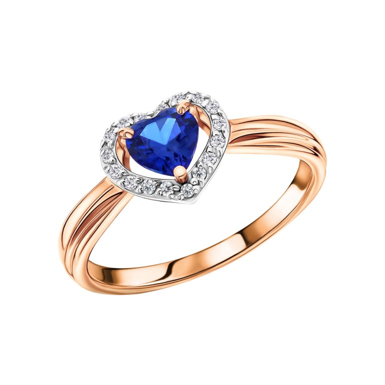 Кольцо с 17 бриллиантами природными, 0.07 карат, огранка круг 17 граней, цвет 2, чистота 2, тип огранки А; 1 сапфиром синтетическим, 0.595 карат, тип огранки Б; Розовое золото 585 пробы.