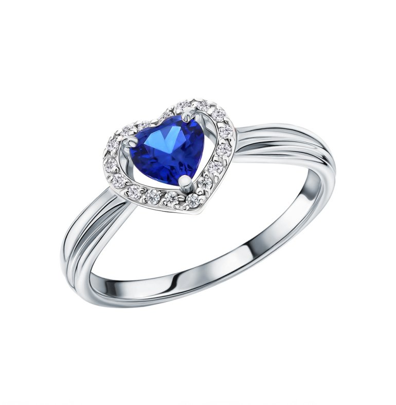 Кольцо с 17 бриллиантами природными, 0.075 карат, огранка круг 17 граней, цвет 2, чистота 2, тип огранки А; 1 сапфиром синтетическим, 0.571 карат, тип огранки Б; Белое золото 585 пробы.