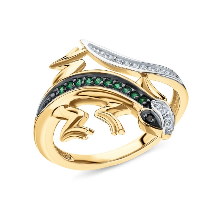 Кольцо с 1 бриллиантом природным, 0.006 карат, огранка круг 17 граней, цвет 2, чистота 2, тип огранки А; 15 бриллиантами природными, 0.041 карат, огранка круг 17 граней, цвет 2, чистота 2, тип огранки А; 2 бриллиантами черными природными облагороженными, 0.01 карат, огранка круг 57 граней, цвет 7, чистота 6, тип огранки А; 10 изумрудами природными, 0.036 карат, цвет 3, чистота 3, тип огранки В; Желтое золото 585 пробы.