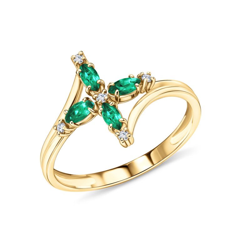 Кольцо с 5 бриллиантами природными, 0.03 карат, огранка круг 57 граней, цвет 3, чистота 6, тип огранки А; 4 изумрудами природными, 0.27 карат, цвет 3, чистота 3, тип огранки Б; Желтое золото 585 пробы.