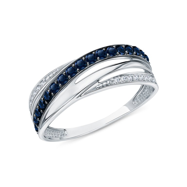 Кольцо с 14 бриллиантами природными, 0.068 карат, огранка круг 17 граней, цвет 2, чистота 2, тип огранки А; 17 сапфирами природными, 0.326 карат, цвет 2, чистота 2, тип огранки В; Белое золото 585 пробы.