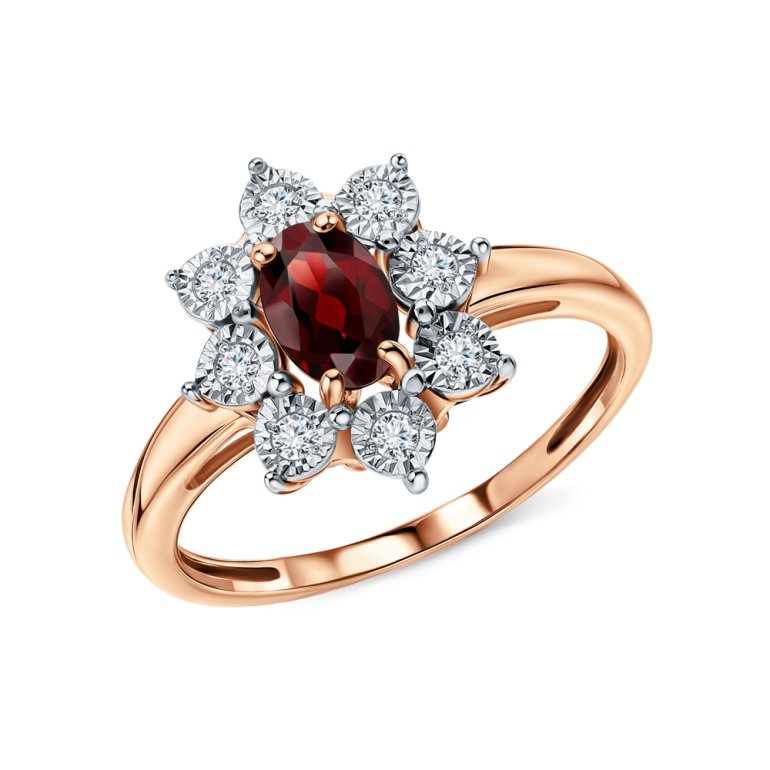 Кольцо с 8 бриллиантами природными, 0.111 карат, огранка круг 57 граней, цвет 4, чистота 5, тип огранки А; 1 гранатом природным, 0.562 карат, тип огранки Б; Розовое и белое золото 585 пробы.