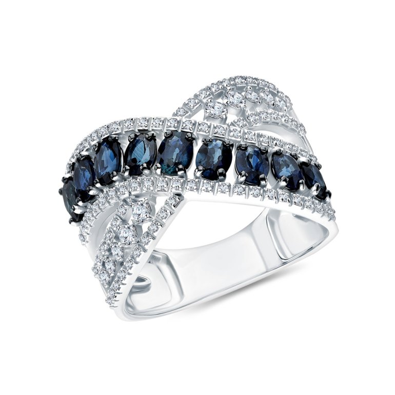 Кольцо с 4 бриллиантами природными, 0.118 карат, огранка круг 57 граней, цвет 3, чистота 6, тип огранки А; 6 бриллиантами природными, 0.08 карат, огранка круг 57 граней, цвет 3, чистота 6, тип огранки А; 76 бриллиантами природными, 0.184 карат, огранка круг 17 граней, цвет 2, чистота 2, тип огранки А; 9 сапфирами природными, 1.871 карат, цвет 5, чистота 2, тип огранки Б; Белое золото 585 пробы.