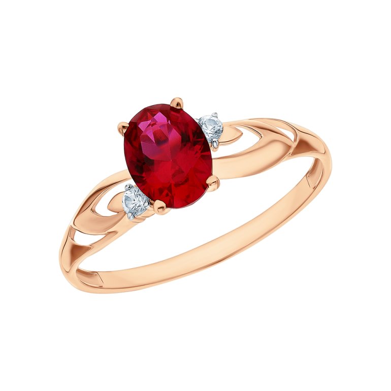 Кольцо с 1 рубином синтетическим, 1.373 карат, тип огранки Б; 2 сапфирами бесцветными, 0.09 карат, тип огранки В; Розовое золото 585 пробы.