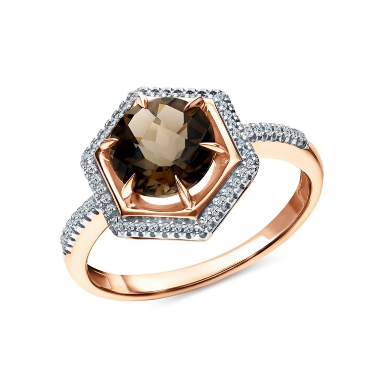 Кольцо с 1 кварцем дымчатым природным, 1.588 карат, огранка круг чекер, тип огранки Б; 56 бриллиантами, 0.12 карат, огранка круг 17 граней, цвет 2, чистота 2, тип огранки А; Розовое золото 585 пробы.