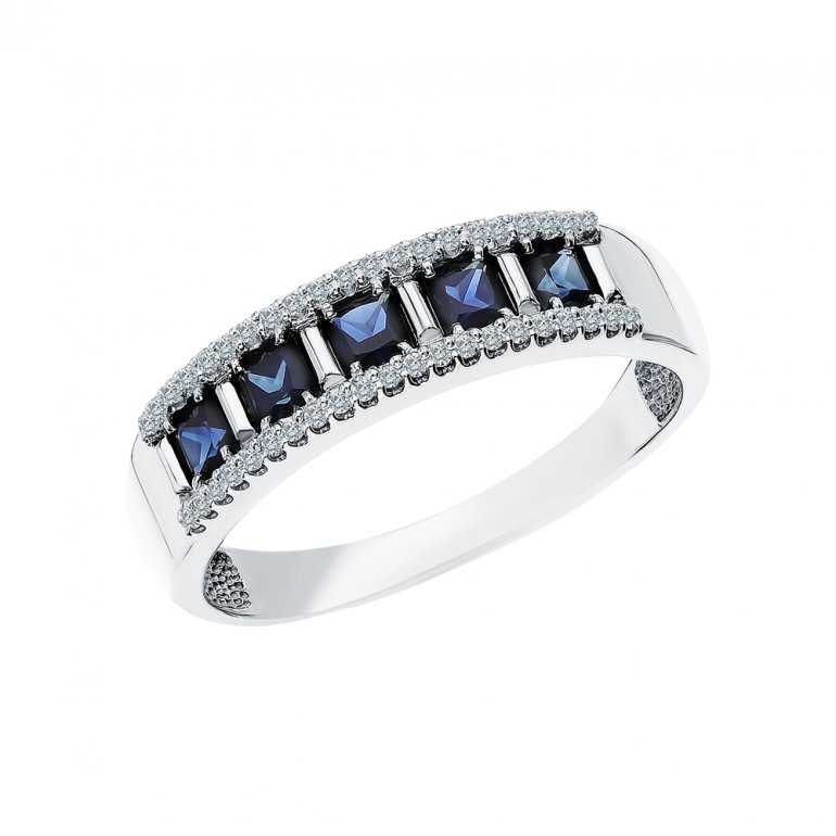 Кольцо с 42 бриллиантами природными, 0.089 карат, огранка круг 17 граней, цвет 2, чистота 2, тип огранки Б; 5 сапфирами природными, 0.505 карат, цвет 2, чистота 2, тип огранки Б; Белое золото 585 пробы.