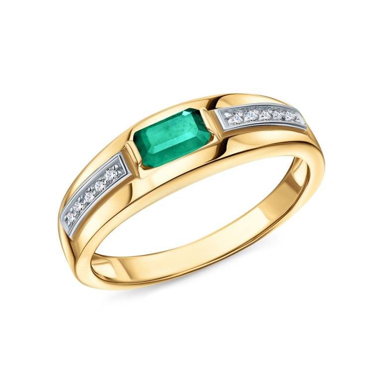 Кольцо с 10 бриллиантами природными, 0.039 карат, огранка круг 17 граней, цвет 2, чистота 2, тип огранки А; 1 гидротермальным изумрудом, 0.227 карат, тип огранки Б; Желтое золото 585 пробы.