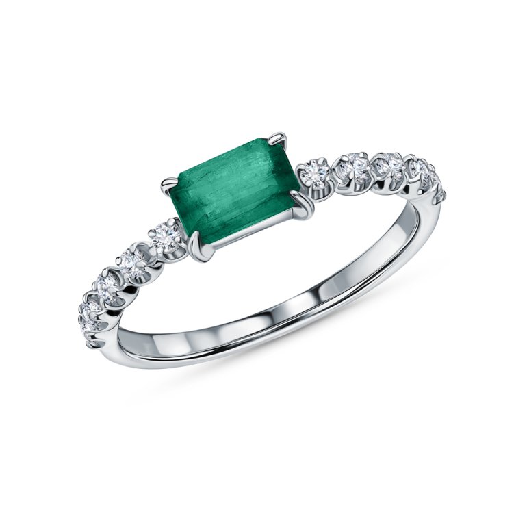 Кольцо с 10 бриллиантами природными, 0.138 карат, огранка круг 57 граней, цвет 3, чистота 6, тип огранки А; 1 изумрудом природным, 0.476 карат, цвет 3, чистота 3, тип огранки Б; Белое золото 585 пробы.