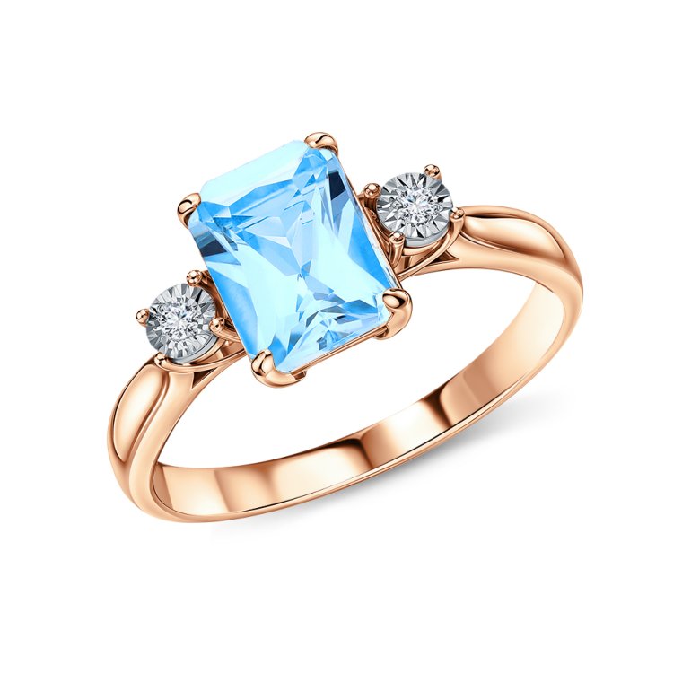 Кольцо с 1 топазом скай природным, 1.888 карат, тип огранки Б; 2 бриллиантами, 0.016 карат, огранка круг 17 граней, цвет 2, чистота 2, тип огранки А; Розовое и белое золото 585 пробы.