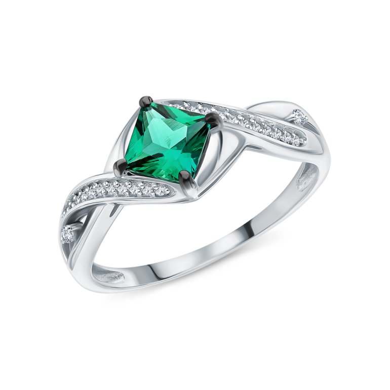 Кольцо с 2 бриллиантами природными, 0.016 карат, огранка круг 17 граней, цвет 2, чистота 2, тип огранки А; 22 бриллиантами природными, 0.048 карат, огранка круг 17 граней, цвет 2, чистота 2, тип огранки А; 1 гидротермальным изумрудом, 0.502 карат, тип огранки Б; Белое золото 585 пробы.