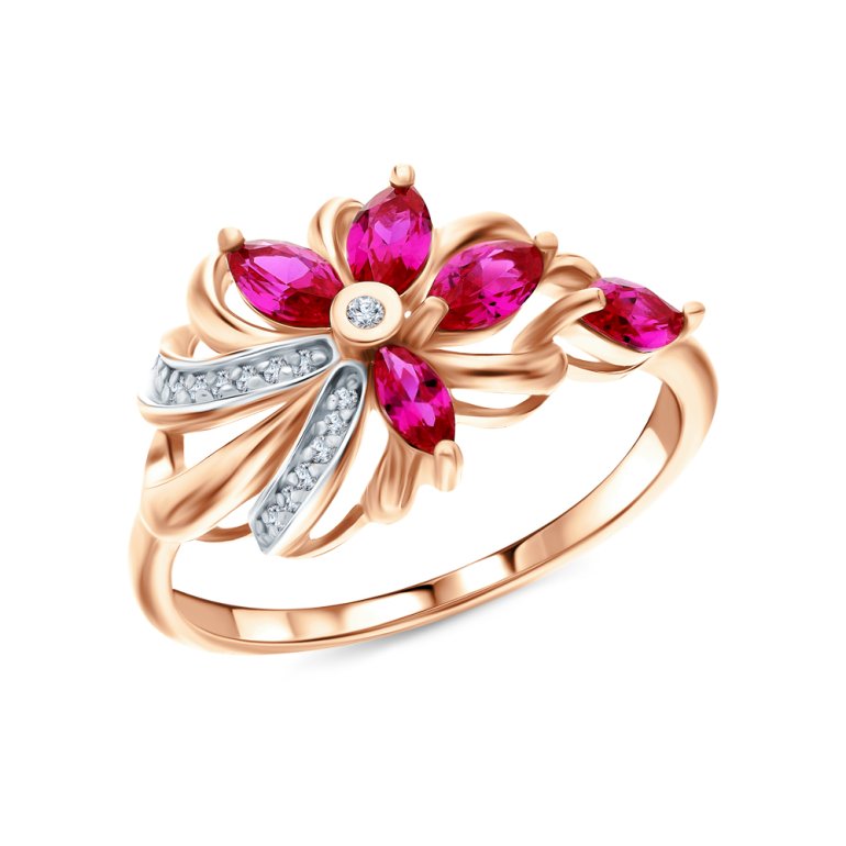 Кольцо с 1 бриллиантом природным, 0.009 карат, огранка круг 17 граней, цвет 2, чистота 2, тип огранки А; 16 бриллиантами природными, 0.034 карат, огранка круг 17 граней, цвет 2, чистота 2, тип огранки А; 4 рубинами синтетическими, 0.577 карат, тип огранки Б; 1 рубином синтетическим, 0.081 карат, тип огранки Б; Розовое золото 585 пробы.