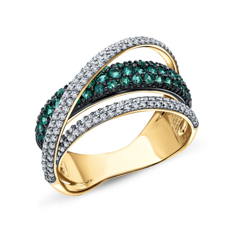 Кольцо с 123 бриллиантами природными, 0.375 карат, огранка круг 17 граней, цвет 2, чистота 2, тип огранки А; 18 изумрудами природными, 0.211 карат, цвет 3, чистота 3, тип огранки В; 34 изумрудами природными, 0.235 карат, цвет 3, чистота 3, тип огранки В; Желтое золото 585 пробы.