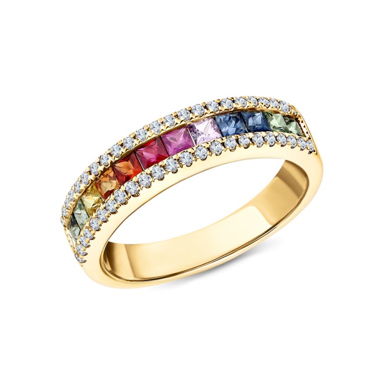 Кольцо с 12 сапфирами мульти, 0.73 карат, тип огранки Б; 46 бриллиантами, 0.2 карат, огранка круг 17 граней, цвет 2, чистота 3, тип огранки Б; 46 бриллиантами, 0.2 карат, огранка круг 17 граней, цвет 2, чистота 3, тип огранки Б; Желтое золото 585 пробы.