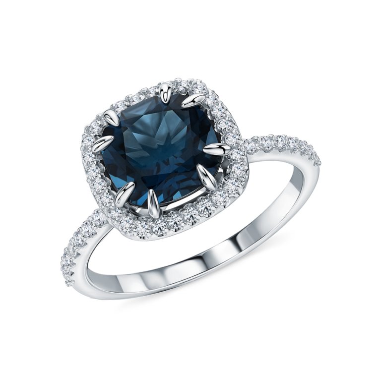 Кольцо с 18 бриллиантами природными, 0.128 карат, огранка круг 57 граней, цвет 3, чистота 6, тип огранки А; 28 бриллиантами природными, 0.141 карат, огранка круг 17 граней, цвет 2, чистота 2, тип огранки А; 1 топазом лондон природным, 2.59 карат, тип огранки Б; Белое золото 585 пробы.